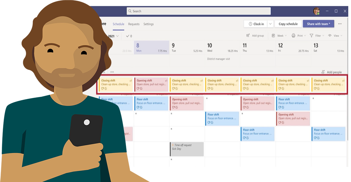 Kerry manages three stores and uses the Shifts app to publish schedules for all of her teams. While traveling between stores, she can quickly check Teams to see who is working that day