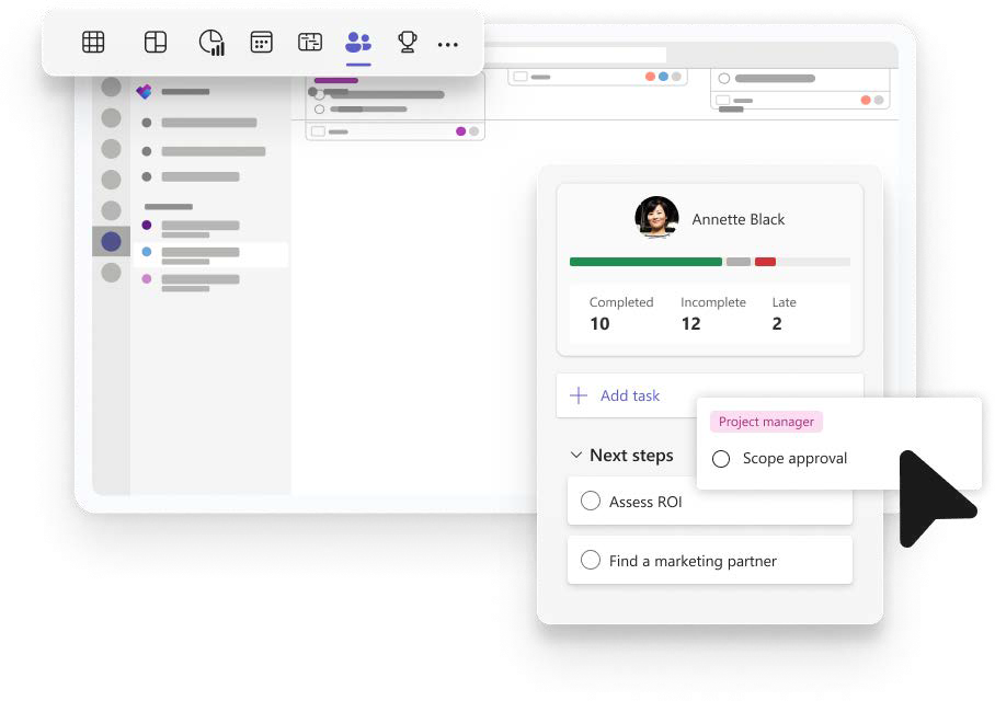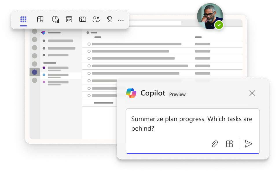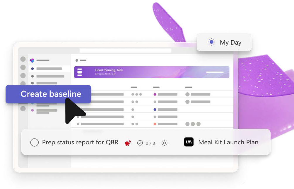 Alex começa sua manhã verificando Meu dia no Planner para ter uma visão única do que ele precisa realizar hoje. Ele vê um atribuição de tarefas vinculado ao plano de lançamento do kit de refeições que ele está liderando: “Relatório de status de preparação para revisão trimestral de negócios (QBR) entre organizações na próxima semana”.